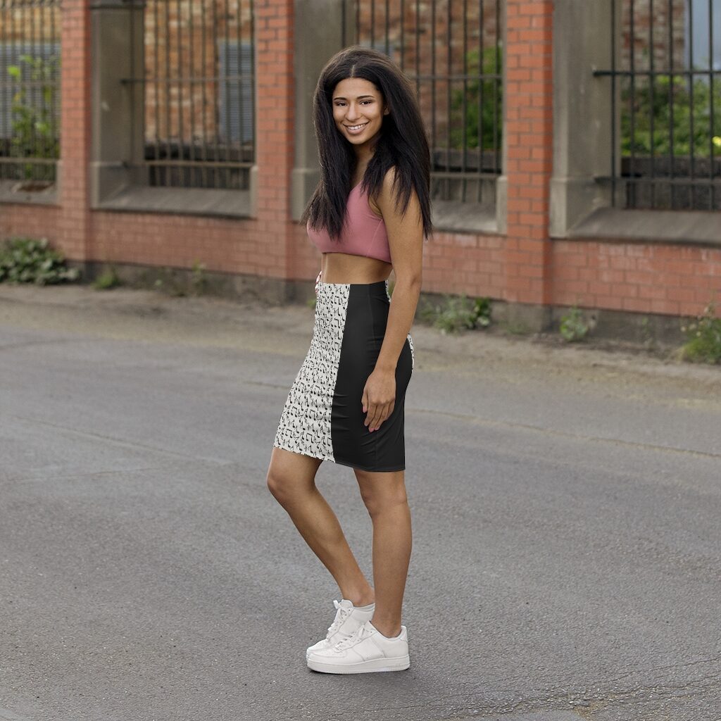 The custom pencil skirt is ideal for unbroken printing. It is made of 88% polyester and 12% spandex. This blend gives the garment a four-way stretch which allows the fabric to stretch both width- and length-wise. The garment has a slight tapering along the outer thigh to provide that signature straightened appearance. Your designs are printed all over the skirt, making for endless customizing avenues.